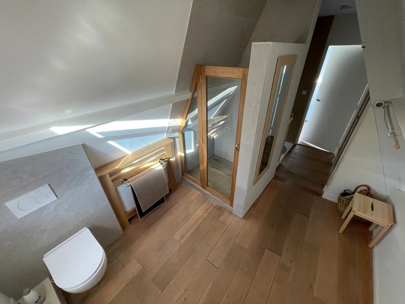 De vaste trap leidt naar eerste verdieping. Daar bevindt zich aan de achterzijde een ruime privé slaapkamer met pittoresk uitzicht en aan de voorzijde een eigen ruime luxe badkamer met inloopdouche en toilet.