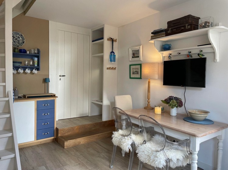 De voorkamer is voorzien van eettafel met stoelen, een gezellige zithoek met tweepersoons bank, kitchenette met koelkast en gelegenheid tot het maken van koffie, thee en een ontbijt. Let op: er kan niet gekookt worden.